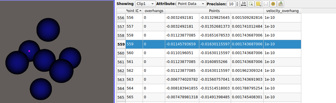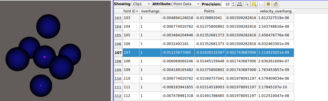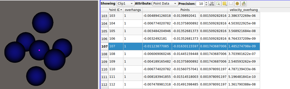 I have data on a structured grid, and I want to visualise which points on my have certain conditions and how they evolve through time. The problem is that visualising with points or point gaussian, also adds some “boundary points”. In the images below, I have two subsequent timesteps. I’m clipping a scalar field (velocity_overhang) to values above 1e-10, (want to do effectively above 0) The point in the middle of the cross has a value that passes the clip, and the 6 real connected neighbours have velocity_overhang 0. I can check this is true in the spreadsheet view. The problem is that the visualisation of the clip adds 6 neighbours around that seem to be the interpolation of where the clipped region would have the boundary (you can see that the x coordinate changes). They also get assigned an “overhangs” value of 0, which is something that I calculate in the code that generates this data and corresponds to the condition that velocity_overhang > 0. So I don’t know if these neighbours are “new” points, or the actual neighbours but shifted?