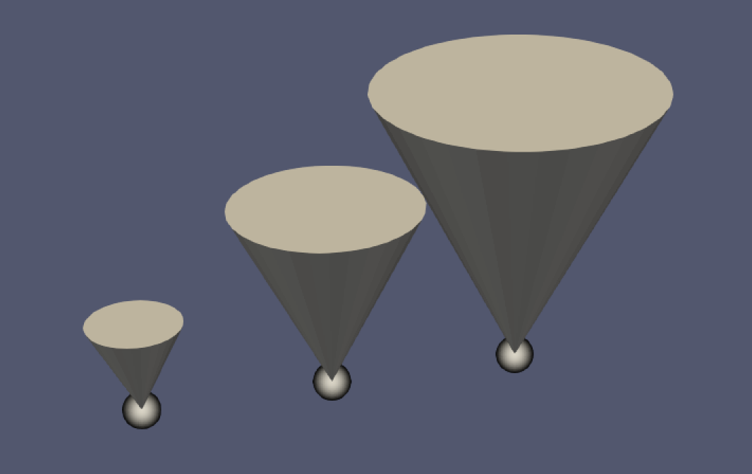 The cone center is set to [-0.5, 0, 0], height is 1 and radius is 0.5. As you can see, the shape stays the same (with aspect ratio 1:1) and the cones are scaled by the given scalar.