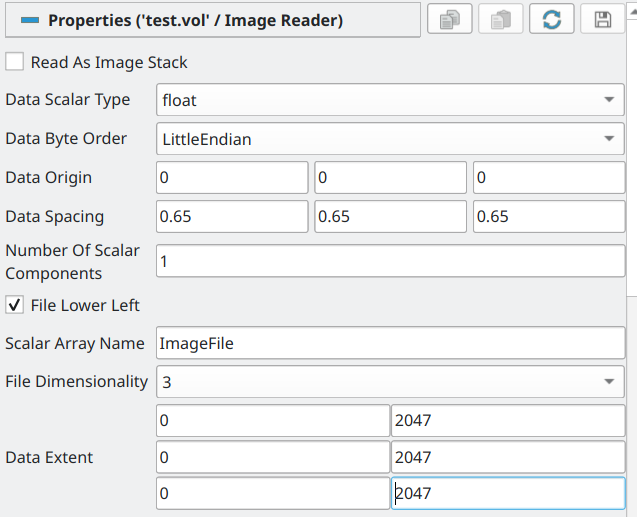 I am opening a raw image file using the following function: def readRawFile(volFilePath=‘’,volInfoFilePath=‘’,format=‘.vol’): if volFilePath[-4:]!=format: volFilePath+=format if volInfoFilePath==‘’: volInfoFilePath=volFilePath+‘.info’ infoValues = {} with open(volInfoFilePath, “r”) as f: for line in f: line = line.strip() if “=” in line: key, value = line.split(“=”) key = key.strip() value = value.strip() infoValues[key] = value imageReaderSource=ImageReader(registrationName=volFilePath.split(‘/’[-1].replace(format,‘’), FileNames=[volFilePath]) imageReaderSource.Set( DataScalarType=‘float’, DataByteOrder=‘LittleEndian’, DataSpacing=[float(infoValues[“voxelSize”]) for i in range(3)], DataExtent=[0, int(infoValues[“NUM_X”])-1, 0, int(infoValues[“NUM_Y”])-1, 0, int(infoValues[“NUM_Z”])-1],) UpdatePipeline() return imageReaderSource,infoValues