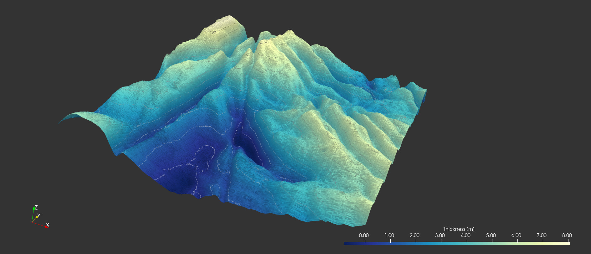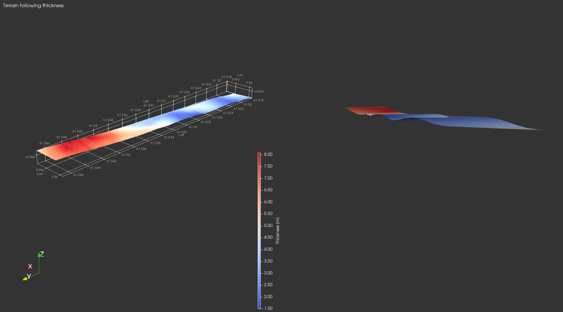 I tried pre-processing your data, in python, and converting to a vtk file. I enclose what the first 5000 point look like. As you can see the surface is terrain following (i.e. following sea bed) and showing sand thickness.