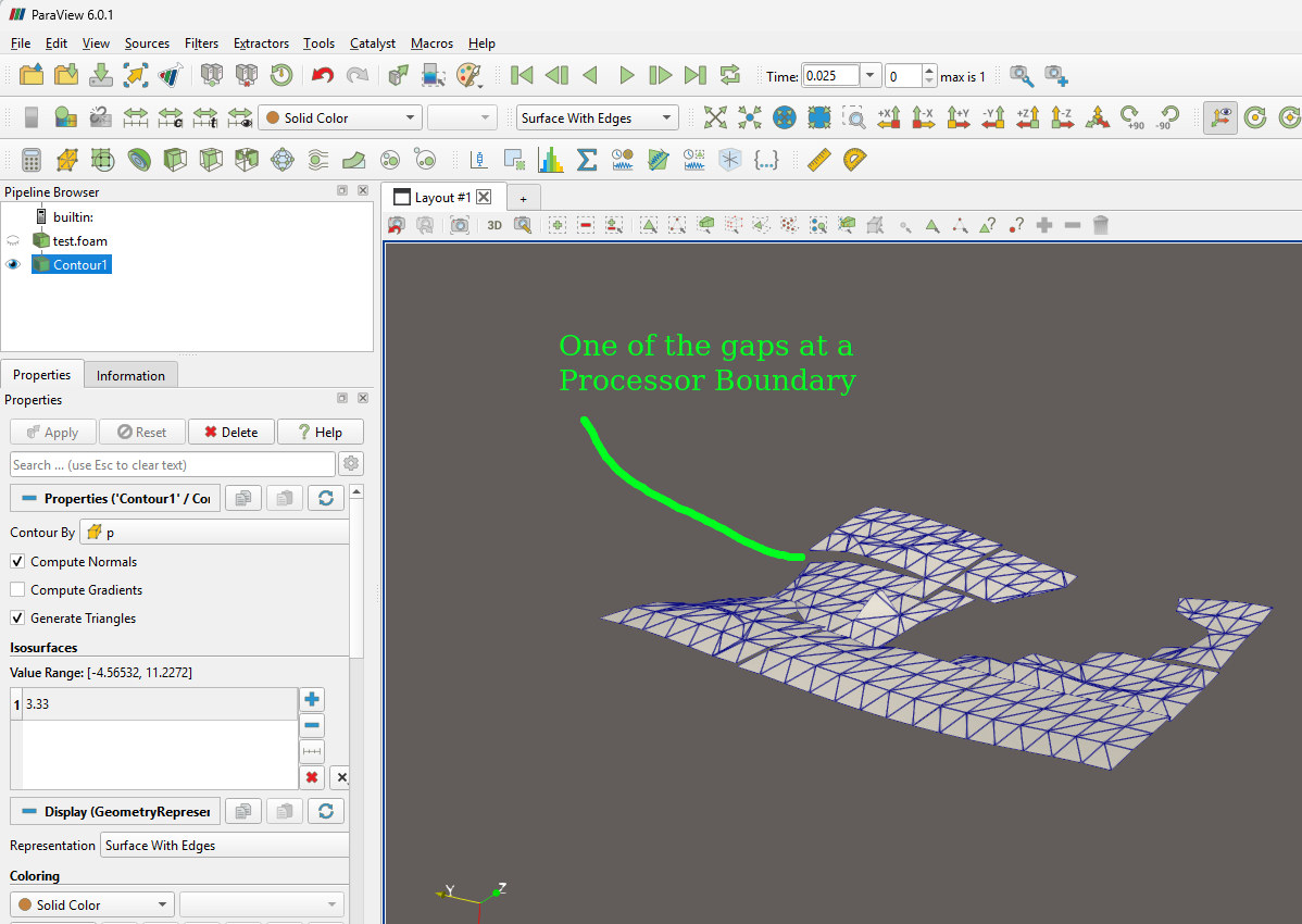 The fundamental problem is that the data sets for each rank are actually handled independently and separately. For the VTK (openfoam) reader part, it actually fires off a reader/parser for handling each of the processor ranks. However, that is not the real issue. The problem is that there no matching up of the processor boundaries and the corner points that you’d need to have proper connectivity between the domains. The lowest hanging fruit that will only help somewhat, would be to also parse out the processor patches. For example, could mark the face points of the neighbour processor side as being ghost points. But this still will not get you the proper contours across processor boundaries.
