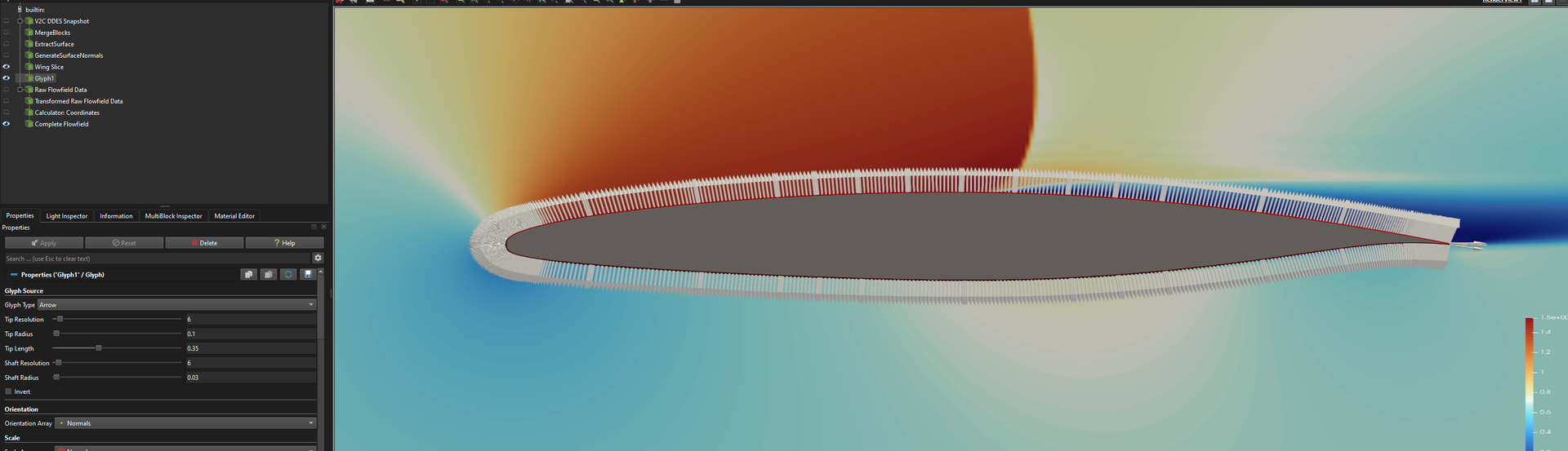 My objective is to create a filter which permits to compute the boundary layer height over a wing and set the value in the wing surface. For this I need to trace normal lines from the surface, probe the velocity (the step where I am stuck), find its value and output the height in the wing’s surface . I believe that ResampleWithDataSet would add much more elements in my pipeline and I wanted to keep it as clean as possible.