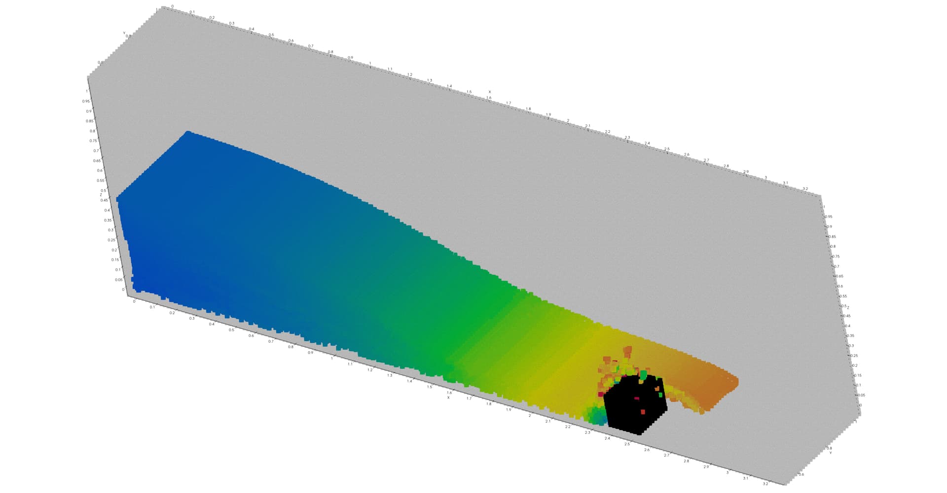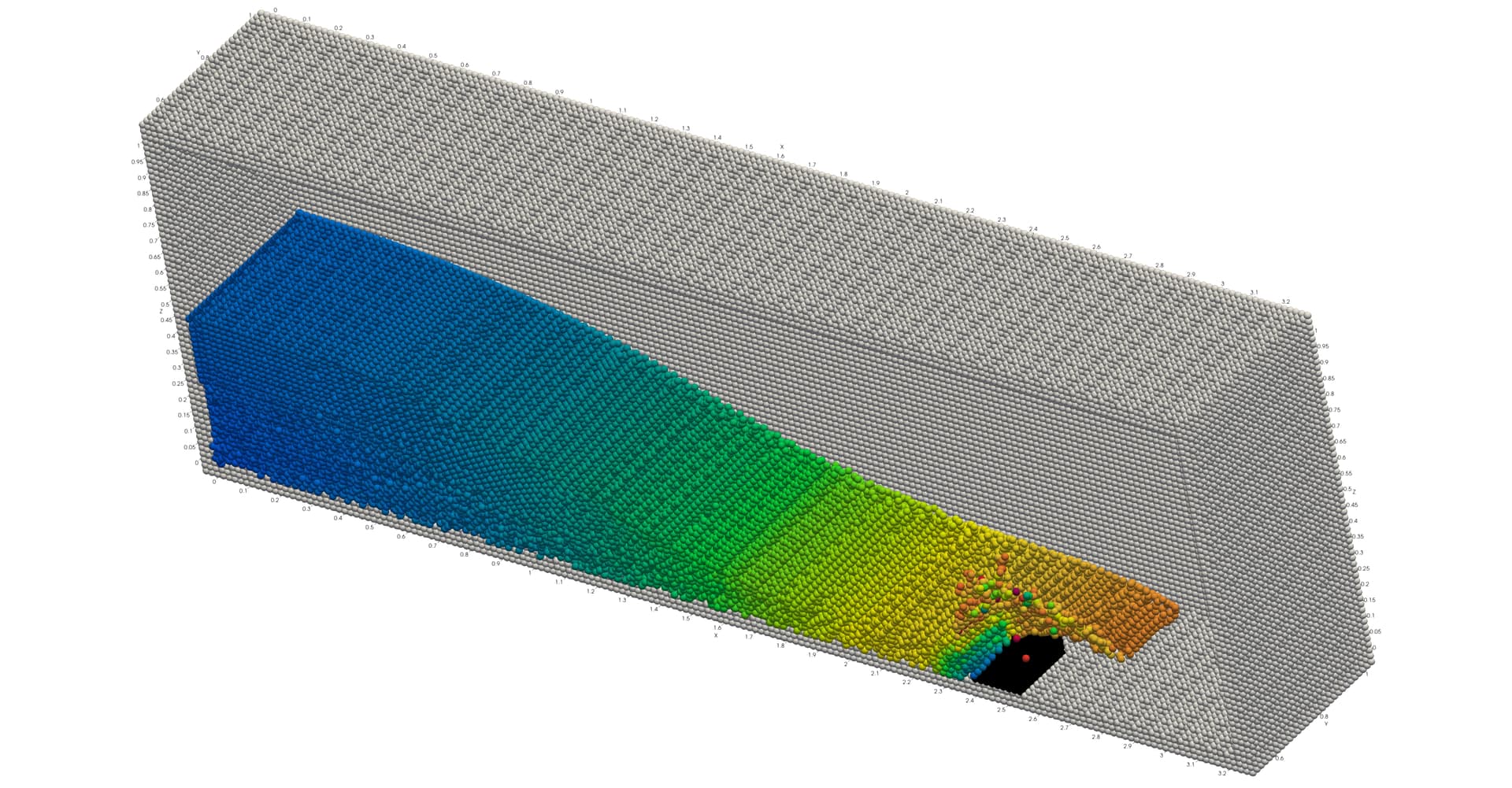 As an example, this is an SPH simulation plotted “normally” (render points as spheres OFF). The pipeline includes a clip to get the cross-section, and two thresholds (one for the fluid, one for the boundary particles). Note the correct Z-order between obstacle (boundary particles), fluid and walls (more boundary particles).